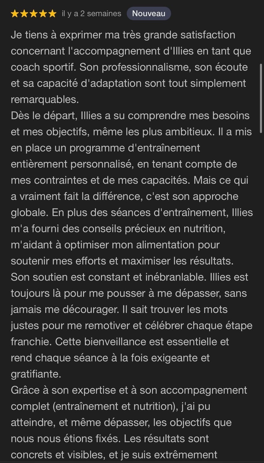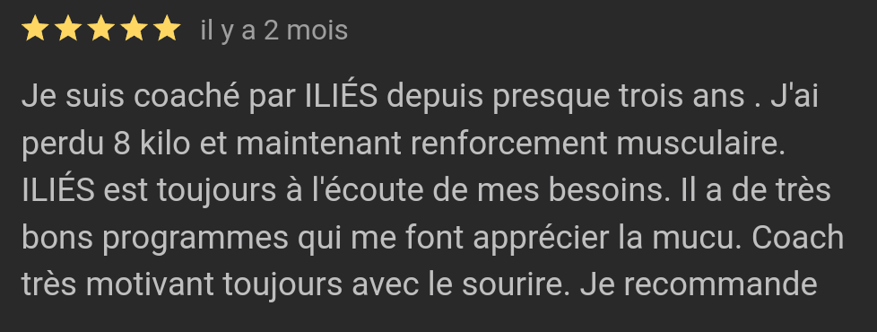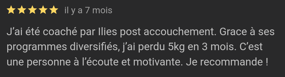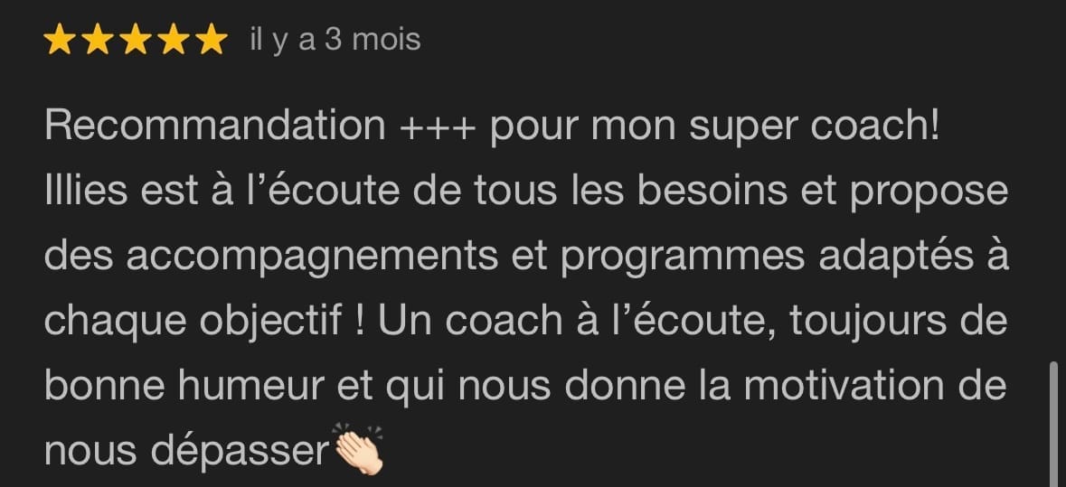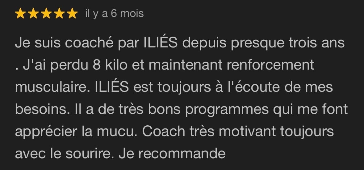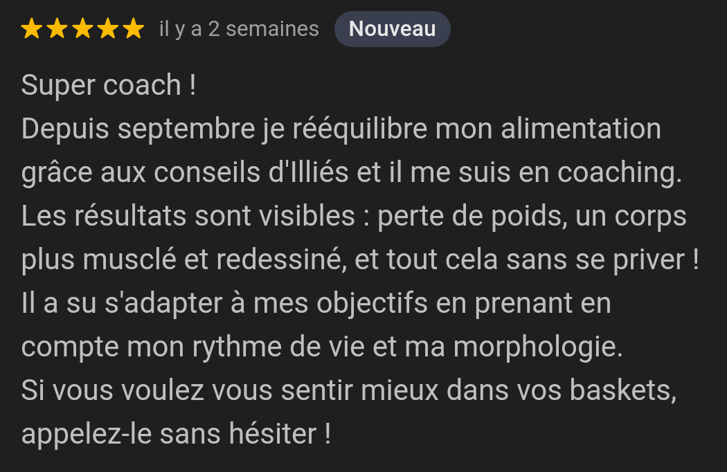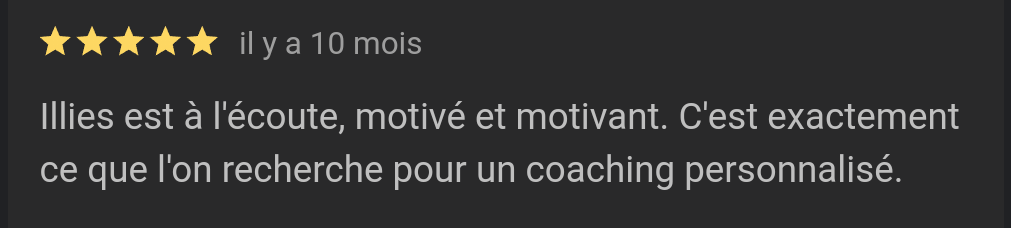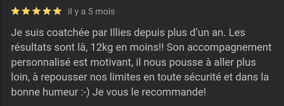 « Je suis coaché par Illies depuis le mois d’octobre et je suis actuellement à -13kg. Il est vraiment à l’écoute et présent! Je recommande. »